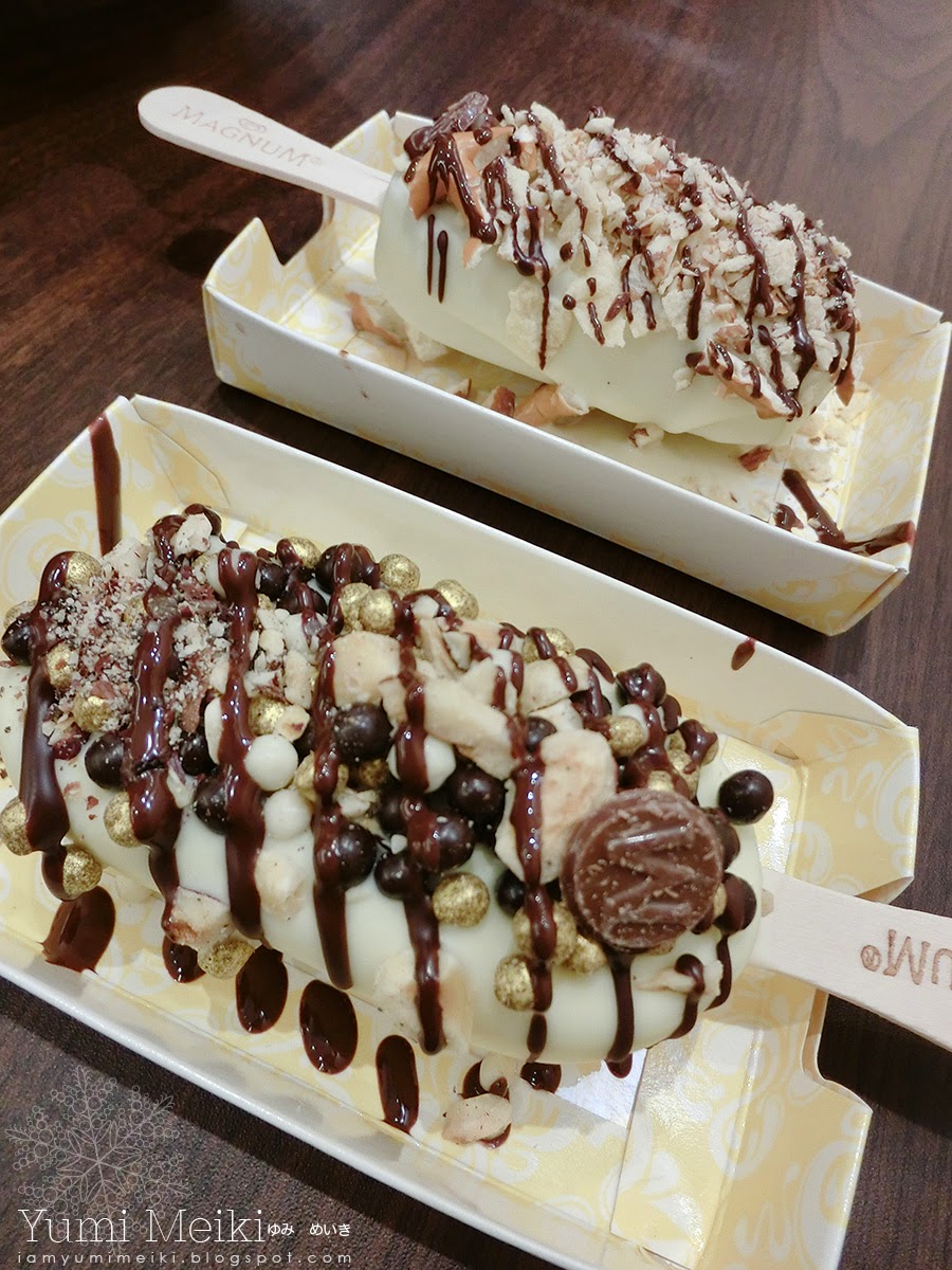 the queue at Magnum Cafe is no longer crazy anymore although we did have to queue for about 10 minutes before it was our turn to choose and create our magnum. so many to choose from but i was only limited to 3 toppings. ><"